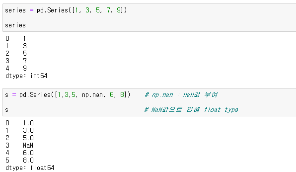 판다스 데이터저장소의 종류는 series, dataframe 2가지이다.