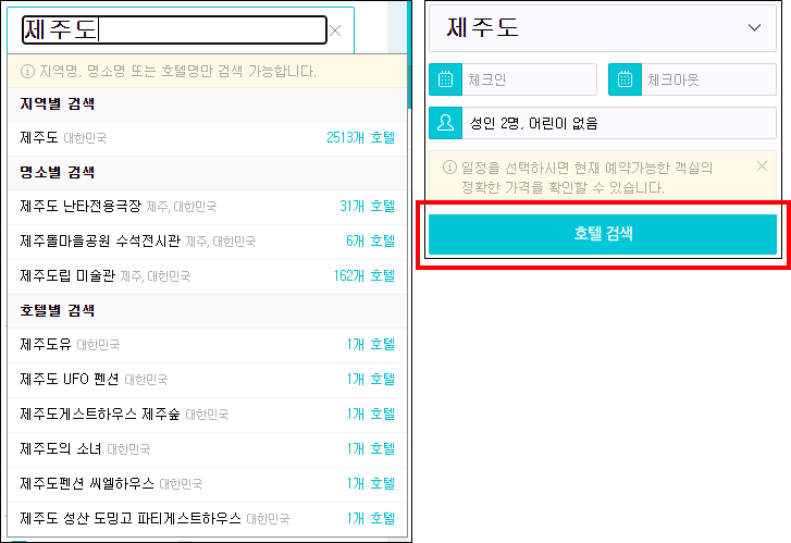 그래서 호텔 검색을 별도로 눌러주어야 했다.