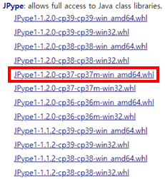 5) JPype1 설치 : https://www.lfd.uci.edu/~gohlke/pythonlibs/