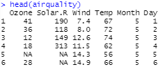 [문제 2] R에서 제공하는 airquality 데이터셋은 일별로 대기의 질을 측정한 자 료를 포함하고 있다. 이 데이터셋에 대해서 다음 문제를 해결하기 위한 코드를 작성하시오.