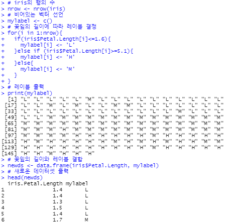 newds <- data.frame(iris$Petal.Length, mylabel)