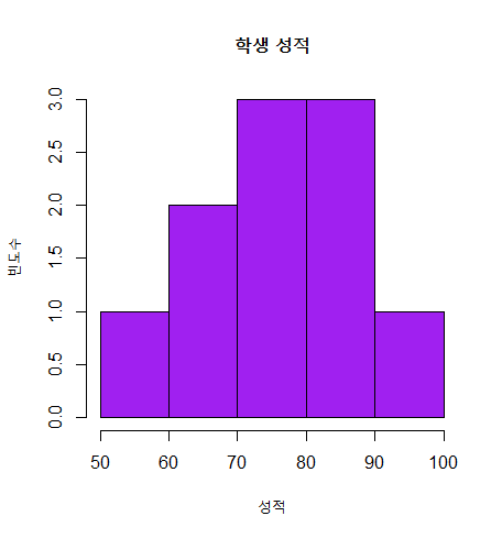 (7) 다음 조건을 만족하는 위 성적에 대한 히스토그램을 작성하시오. (그래프 제목: 학생 성적, 막대의 색: 보라색)