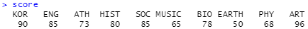 names(score) <- c("KOR","ENG","ATH","HIST","SOC","MUSIC","BIO","EARTH","PHY","ART")
